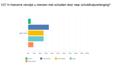 Wel valt op dat veel respondenten (8) inwoners met schulden nauwelijks doorverwijst naar schuldhulpverlening (terwijl de gemeente het meest bekend is). Hiervoor wordt als reden gegeven dat inwoners alleen naar schuldhulpverlening worden gestuurd als de schulden problematisch zijn óf als alle andere opties al geprobeerd zijn. Er wordt dus eerst bij de andere organisaties aangeklopt alvorens men naar de gemeente gaat. Interessant zou zijn waarom.