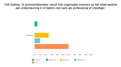 Uit de resultaten blijkt dat het overgrote deel van de respondenten (13 van de 19) het totale aanbod aan ondersteuning promoot in hun contact met de inwoners. Ook blijkt dat zij goed weten waar zij terecht kunnen met vragen over dit aanbod (16 van de 19). Het is belangrijk dat andere organisaties de weg weten naar de gemeente en inwoners deze kunnen wijzen.