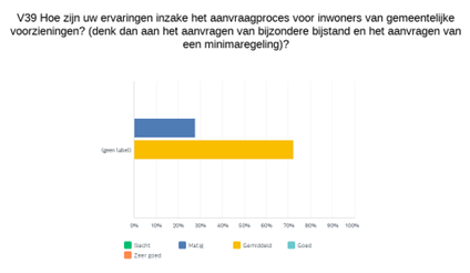 Tot slot zijn er ook een aantal vragen gesteld over het aanvraagproces voor inwoners van gemeentelijke voorzieningen (vb. BB of minima). Hieruit is gebleken dat 13 respondenten het met een gemiddeld beoordelen en 5 met een matig.