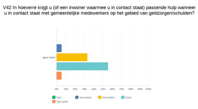 Uit de antwoorden van de respondenten blijkt opnieuw dat de regelingen wel passend zijn voor de doelgroepen, maar dat ze de mensen niet bereiken. Zo geven 6 respondenten aan dat het totale aanbod goed aansluit bij inwoners, 13 gemiddeld en 2 nauwelijks (9 niet ingevuld). Echter, wanneer gevraagd wordt of het ook resultaat heeft, geven slechts 2 respondenten aan dat het goed is, 11 gemiddeld en 6 nauwelijks. Hierbij wordt telkens aangegeven dat de bekendheid bij inwoners niet voldoet en dat mensen onvoldoende financieel vaardig zijn. Ook wordt benoemd dat mensen zich niet durven aan te melden voor ondersteuning, vaak vanwege schaamte.