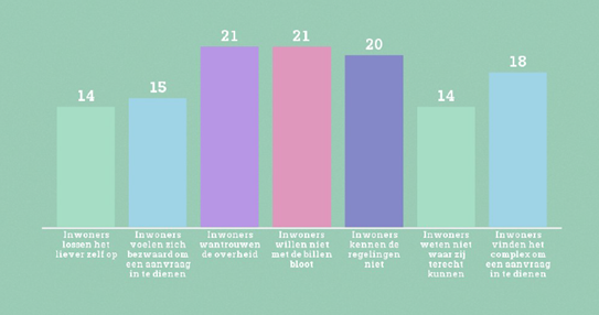 Daarnaast is gevraagd welke redenen respondenten zien waardoor inwoners geen gebruik maken van het totaal aan hulpaanbod. Veelgenoemde redenen zijn het gebrek aan laagdrempelige informatie/contact, te weinig overzicht van het totale aanbod en de schaamte om aan de bel te trekken. Een respondent merkt op dat mensen bang zijn de financiële ondersteuning terug moeten betalen en daardoor alles zelf op willen lossen. Een aantal andere respondenten geven aan dat er door het gebrek aan laagdrempelige informatie te weinig vertrouwen is in de hulp, waardoor mensen niet de stap zetten om hulp aan te vragen. Een gebrek aan digitale vaardigheid speelt bij sommige inwoners ook een grote rol hierin.