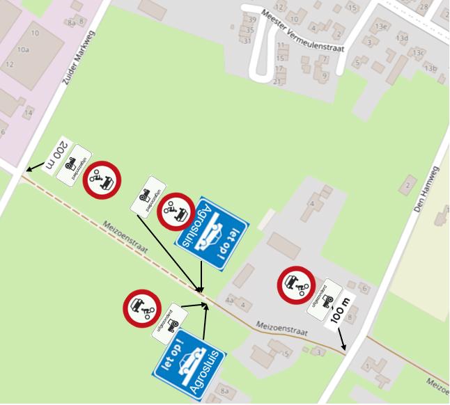 4. Het plaatsen van bord C12 uit bijlage 1 van het RVV 1990 met onderbord “Uitgezonderd landbouwverkeer” OB55 en “200m” waar de Meizoenstraat aansluit op de Zuider Markweg.