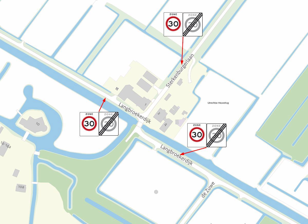 het instellen van een 30km/u zone op en rondom de kruising van de Langbroekerdijk en de Sterkenburgerlaan te Driebergen-Rijsenburg door middel van het plaatsen van verkeersborden A01 30-ZB (begin zone) en A01 30-ZE (einde zone) uit bijlage I van het Regelement Verkeersregels en Verkeerstekens 1990 (RVV1990) op de Langbroekerdijk en de Sterkenburgerlaan zoals weergegeven in de bijgevoegde situatieschets.