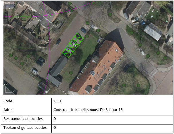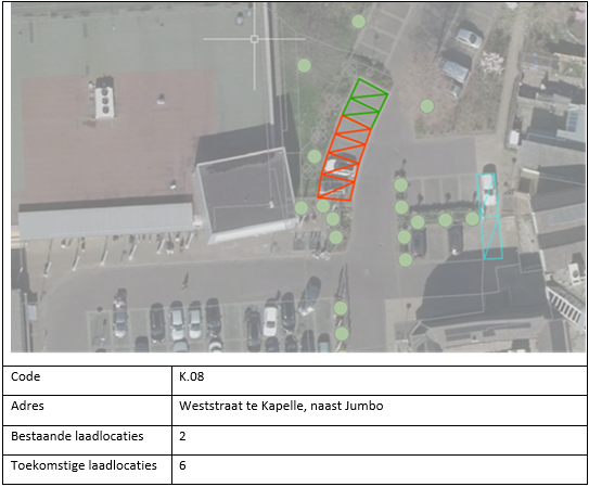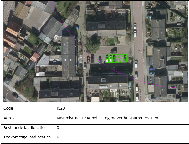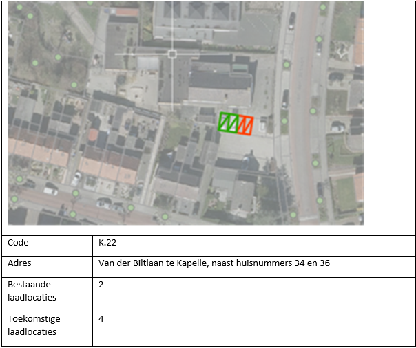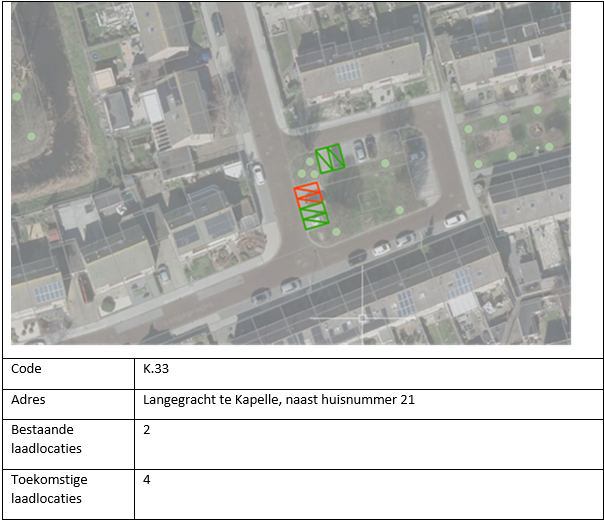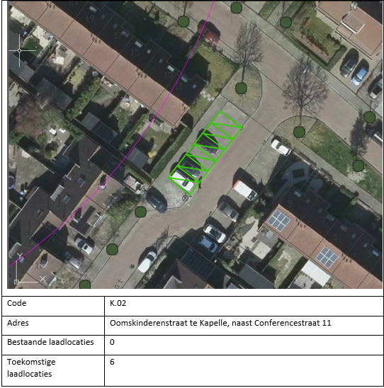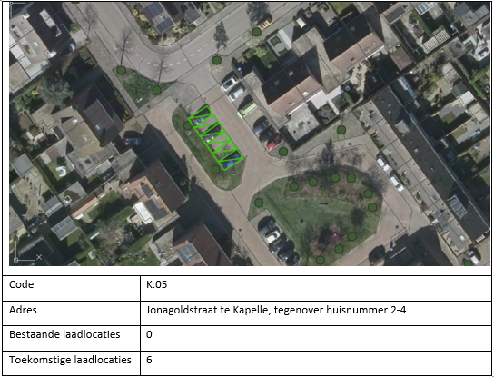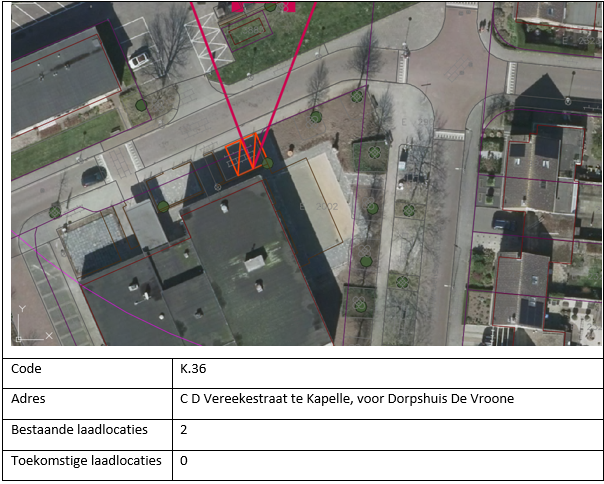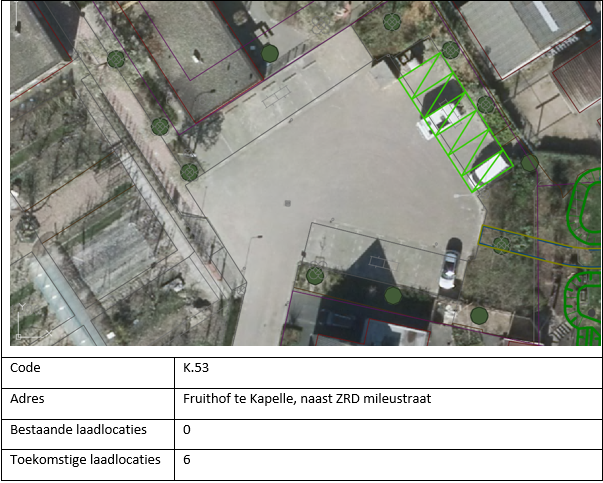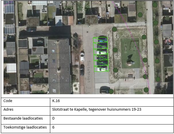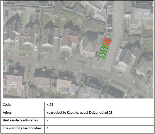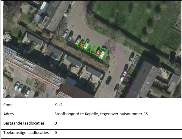 De gemeente Kapelle werkt aan een dekkend netwerk van laadpalen in de gemeente. Om het laden van voertuigen goed te faciliteren reserveren we de parkeervakken bij laadpalen alleen voor het laden van elektrische voertuigen. Hiervoor is een verkeersbesluit nodig. We werken momenteel aan twee verkeersbesluiten. Eén voor alle bestaande laadpalen en één voor alle toekomstige laadpalen. De toekomstige laadpalen plaatsen we niet meteen. We laten pas laadpalen plaatsen als er vraag naar is. Door deze verkeersbesluiten in één keer te nemen besparen we later veel tijd in het aanvraagproces van een laadpaal. In dit document staan met rood de parkeervakken aangegeven die we bij bestaande laadpalen reserveren en in groen de plekken die we reserveren voor toekomstige laadpalen.