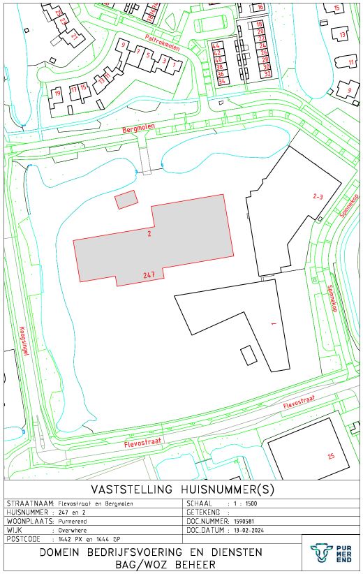 Kennisgeving huisnummerbesluit Flevostraat 247 en Bergmolen 2 Purmerend
