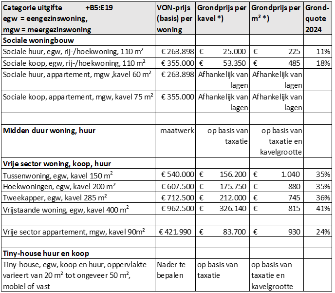 Voor grondprijzen van overige grondgebonden woningen in de koopsector geldt een grondprijs per categorie waarin de woning valt. De grondprijs is op basis van uitgevoerde taxaties,(comparatief dan wel residueel) bepaald.