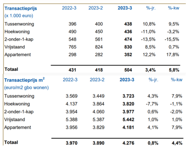 Hieruit blijkt dat de gemiddelde transactieprijs per woning ten opzichte van een jaar eerder 3,4% hoger liggen en ten opzichte van het derde kwartaal 2022 met 5,8% zijn gestegen. Voor de vierkante meterprijs is dit respectievelijk 0,8% en 4,4%.