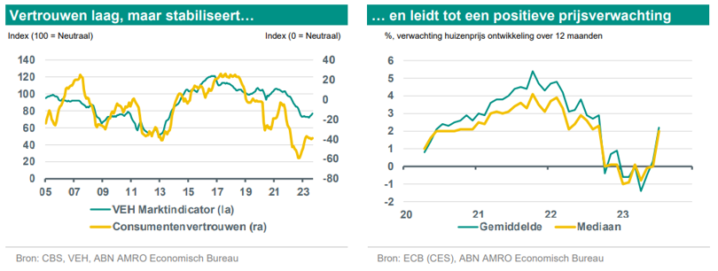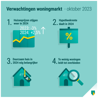 ABN schrijft in haar “Woningmarktmonitor van oktober 2023: De huizenprijzen zijn de afgelopen drie maanden licht gestegen, maar blijven momenteel redelijk gelijk. De gemiddelde huizenprijs is wel hoger dan eerder gedacht en staat nu 4,3% lager dan tijdens de piek in juli 2022. Sinds de top zijn de prijzen het hardst gedaald in de grote steden. We dachten eerst dat de huizenprijzen in 2023 zouden dalen met 5%, maar we verwachten dat het eind van het jaar uitkomt op een daling van 3%. Door positieve ontwikkelingen verwachten we dat de huizenprijzen in 2024 niet gaan dalen met 3% zoals we eerder voorspelden, maar gaan stijgen met 2,5%.