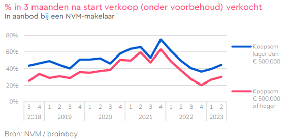Van de woningen met een vraagprijs lager dan € 500.000 die in het 2e kwartaal van 2023 beschikbaar kwamen, was 45% binnen drie maanden (onder voorbehoud) verkocht. Bij de woningen met een hogere vraagprijs was dit 30%. In de volgende grafiek is dit aangegeven.