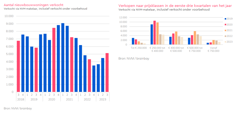 In de “Analyse woningmarkt 3e kwartaal 2023”van de Nederlandse Vereniging van Makelaars (NVM) geeft de NVM aan de onzekerheid van consumenten over de toekomstige verkoop van de eigen woning niet meer het belangrijkste obstakel in de nieuwbouwverkoop is. Inmiddels geven makelaars aan dat deze onzekerheid afneemt. Het thema speelt nog wel een belangrijke rol, maar door de aantrekkende bestaande bouw markt en de bijbehorende prijsstijgingen, weerhoudt dit minder consumenten in het kopen van een nieuwbouwwoning.