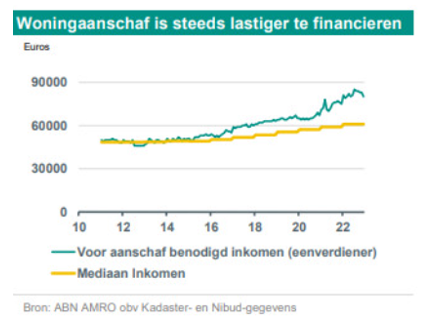 De ABN geeft de volgende voorspelling af: de ABN verwacht dat de daling van het aantal woningaankopen nog doorzet met -5% in 2023 en -2,5% in 2024. Ondertussen groeit de vraag naar woningen verder richting een historisch hoogtepunt. Daardoor moeten kopers langzamerhand vaker tegen elkaar opbieden om zeker te zijn van de woning. Het percentage woningaankopen waarbij wordt overboden ligt nu op 42%, terwijl dat in december 2022 nog slechts 10% was.