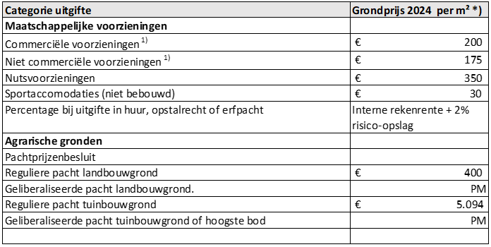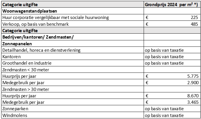 In Tabel 1 “Overzicht grondprijzen 2024” hierna is een overzicht van de grondprijzen 2024 opgenomen. Deze grondprijzen zijn van kracht na bestuurlijke besluitvorming en na publicatie.