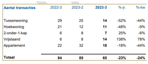In het 3e kwartaal zijn 19% meer transacties geregistreerd dan in hetzelfde kwartaal een jaar eerder. Dit was voor het laatst het geval in het 2e kwartaal van 2021. Kanttekening hierbij is dat een jaar geleden sprake was van sterk afnemende verkopen, waardoor de verkoopcijfers zeer laag waren.