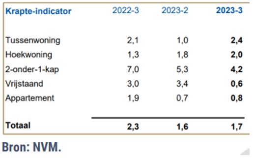 Een woningzoekende kan uit 1,7 woning een keus maken voor een woning. In het derde kwartaal van 2022 was dit getal 2,3. De markt is ten aanzien van het aanbod van woningen verslechterd in het derde kwartaal van 2023 ten opzichte van het derde kwartaal van 2022. Woningzoekende hebben een beperkte keuze in het zoeken naar een voor hen geschikte woning door het beperkte aanbod. In de figuur zijn de cijfers van de krapte op een rijtje gezet. Per categorie is de krapte aangegeven. Krapte zit bij alle woningen. De krapte bij twee-onder-een-kap woning valt bijna in de rage 5 – 10 woningen waaruit een woningzoekende kan kiezen.