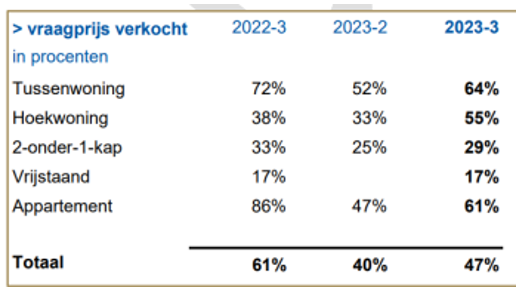 In de figuur hierna wordt getoond het aandeel van de woningen die boven de vraagprijs zijn verkocht. Gemiddeld is in 47% van de verkopen boven de vraagprijs verkocht. Met name is dit van toepassing op hoek- en tussenwoningen en ook appartementen zijn voor een hoger bedrag dan de vraagprijs van eigenaar gewisseld.
