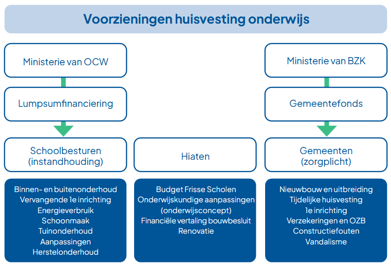 De financiering van onderwijshuisvesting is zowel bij schoolbesturen als bij de gemeente belegd.