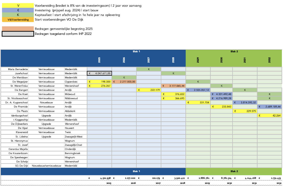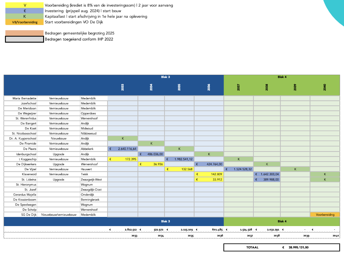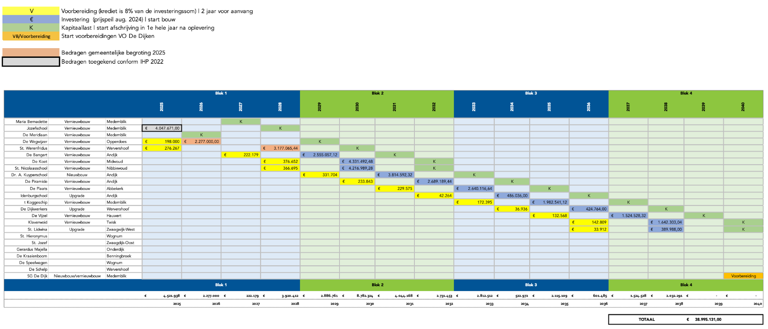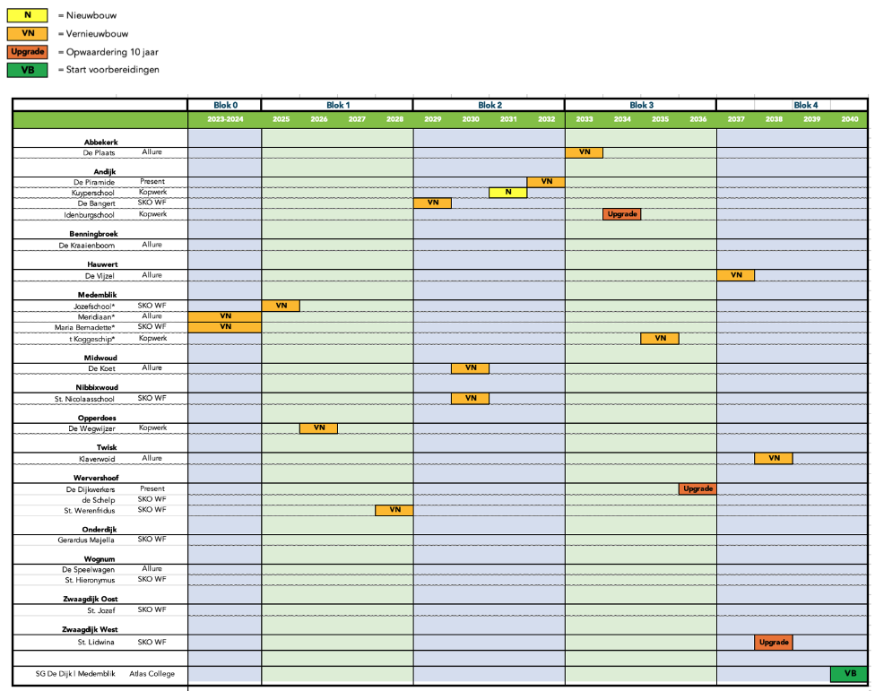Onderstaand de planning zoals deze is in samenspraak tussen gemeente Medemblik en de schoolbesturen tot stand is gekomen. Hierin worden de verschillende blokken qua planning uitgewerkt. In ieder blok worden er een aantal scholen aangedragen voor nieuwbouw of vernieuwbouw. Voorafgaand aan ieder bouwplan wordt er een businesscase gemaakt. Hieruit moet blijken of een school beter kan nieuwbouwen of vernieuwbouwen.