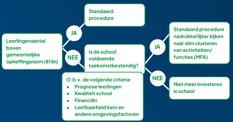De beleidsregel voor kleine scholen, zoals opgesteld in het IHP 2022, blijft van kracht in het huidige IHP. De beslisboom helpt bij het maken van strategische keuzes rond investeringen in scholen. De toekomstbestendigheid van scholen wordt beoordeeld op basis van leerlingaantallen, de kwaliteit van het onderwijs en de duurzaamheid van het gebouw.