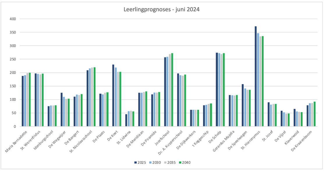 Uitgangspunt voor de ramingen zijn de prognosecijfers zoals deze door het bedrijf xxllnc Sociaal in juni 2024 zijn opgesteld. Daarbij gaan we uit van het gemiddelde aantal leerlingen over 15 jaar vanaf 2024.