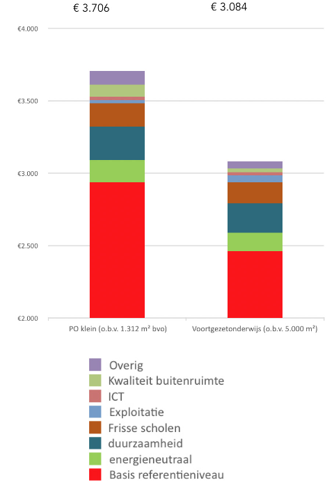Uitgaande van BENG als financiering voor de gemeente resulteert dat voor het primair onderwijs in een budget per m2 bruto vloeroppervlak van € 3.556 per m2 (€3.706 minus €150 eigen bijdrage voor ENG).