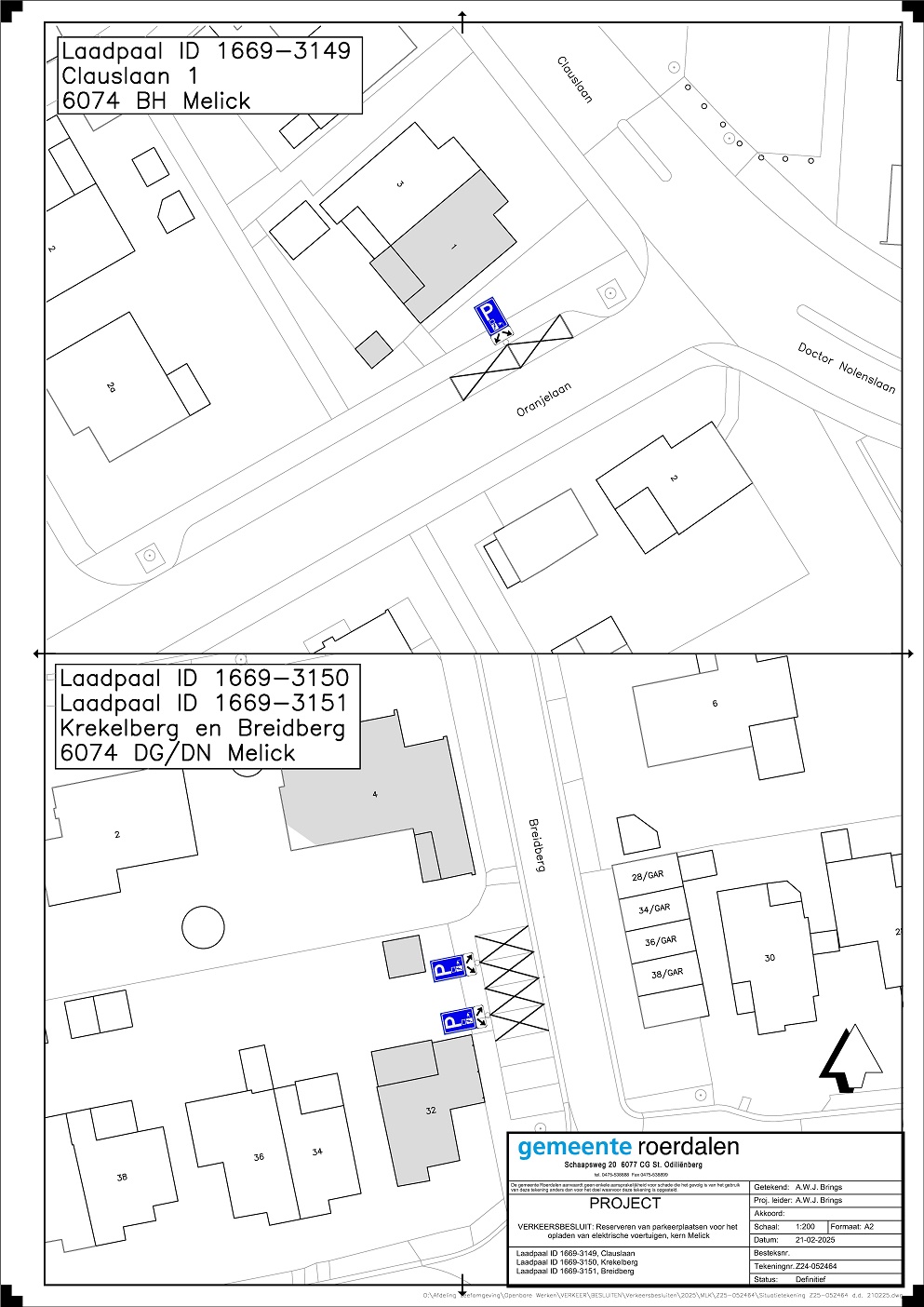 Een 6-tal parkeerplaatsen worden aangewezen en gereserveerd voor het opladen van elektrische voertuigen op de onderstaande genoemde locaties binnen de kern Melick in de gemeente Roerdalen. Een en ander wordt gerealiseerd door het plaatsen van het verkeersbord E8c (RVV1990) ondersteund met het onderbord OB504 en aangevuld met ondersteunende markering(en). Zie situatietekening Z25-052464.