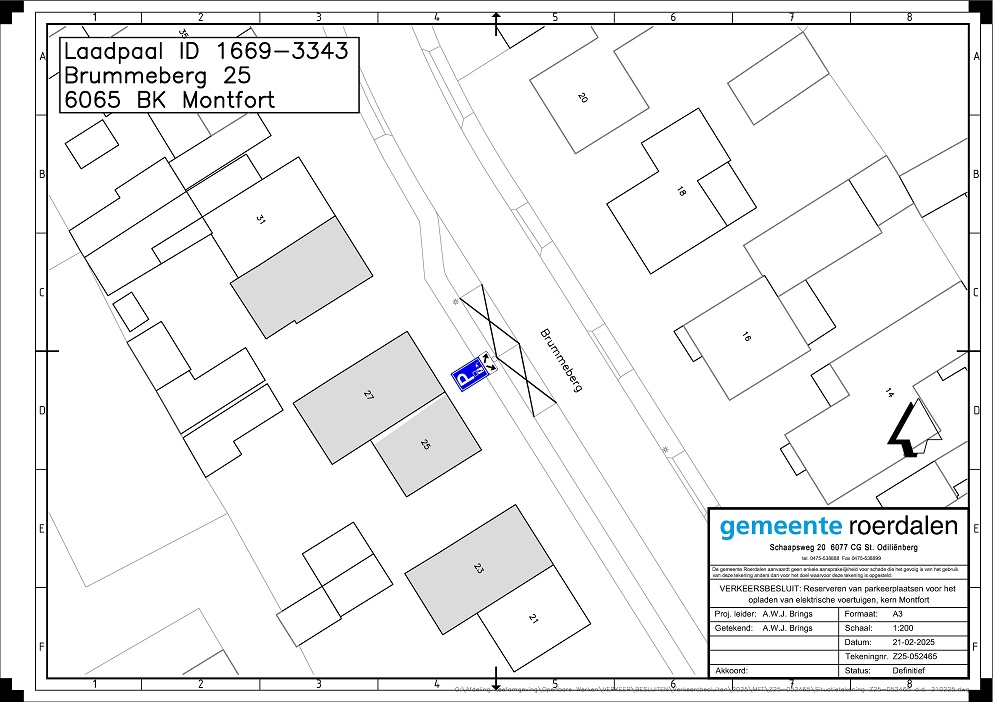 Een 6-tal parkeerplaatsen worden aangewezen en gereserveerd voor het opladen van elektrische voertuigen op de onderstaande genoemde locaties binnen de kern Montfort in de gemeente Roerdalen. Een en ander wordt gerealiseerd door het plaatsen van het verkeersbord E8c (RVV1990) ondersteund met het onderbord OB504 en aangevuld met ondersteunende markering(en). Zie situatietekening Z25-052465.
