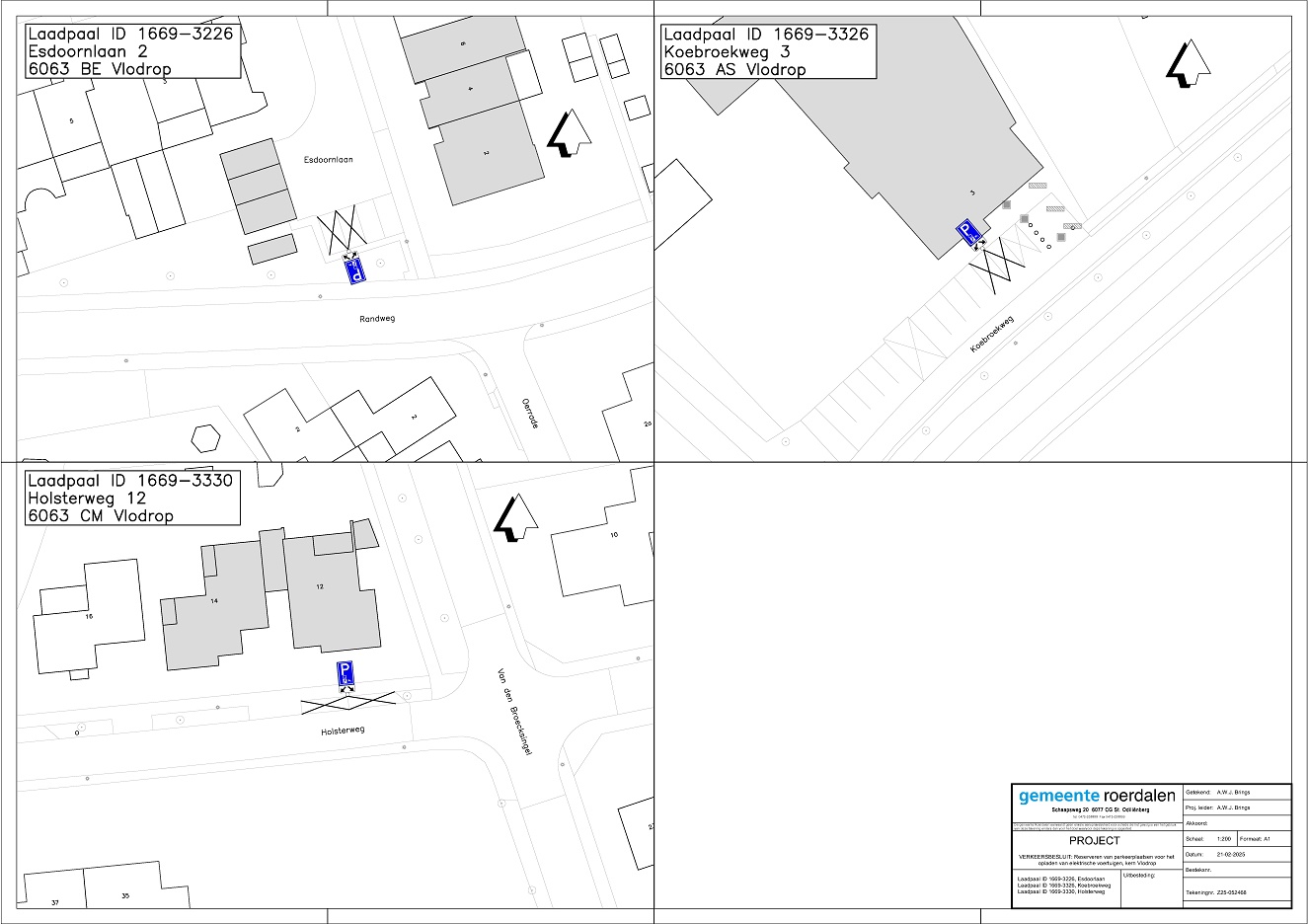 Een 6-tal parkeerplaatsen worden aangewezen en gereserveerd voor het opladen van elektrische voertuigen op de onderstaande genoemde locaties binnen de kern Vlodrop in de gemeente Roerdalen. Een en ander wordt gerealiseerd door het plaatsen van het verkeersbord E8c (RVV1990) ondersteund met het onderbord OB504 en aangevuld met ondersteunende markering(en). Zie situatietekening Z25-052468.