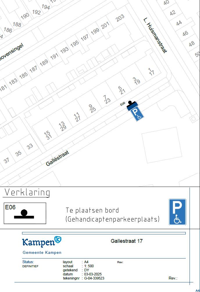 - nabij de Galléstraat 17 in Kampen één openbare parkeerplaats aan te wijzen als gehandicaptenparkeerplaats op kenteken door het plaatsen van een verkeersbord conform het model E6 van bijlage 1 RVV 1990 inclusief onderbord met het kenteken van het voertuig;