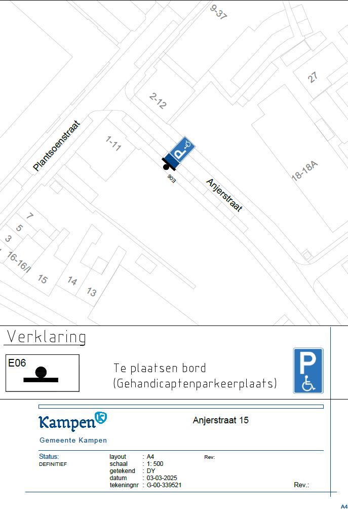 - nabij de Anjerstraat 15 in Kampen één openbare parkeerplaats aan te wijzen als gehandicaptenparkeerplaats op kenteken door het plaatsen van een verkeersbord conform het model E6 van bijlage 1 RVV 1990 inclusief onderbord met het kenteken van het voertuig;