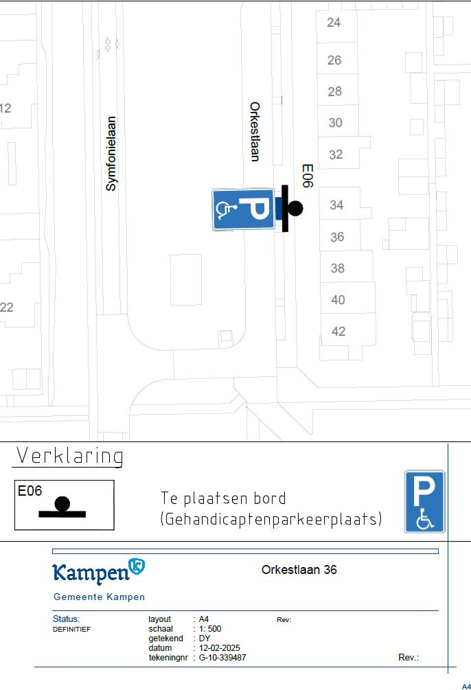 - de gemeente Kampen op 25 februari 2025 verkeersbesluit 75647 heeft gepubliceerd met zaaknummer: 10700-2025, met daarin het voornemen om één openbare parkeerplaats aan te wijzen als gehandicaptenparkeerplaats op kenteken nabij Orkestlaan 36;
