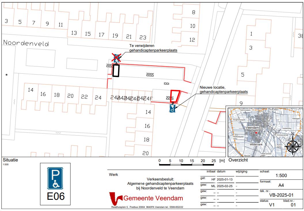 De locatie van de gehandicaptenparkeerplaats zoals aangegeven in het verkeersbesluit “V E R K E E R S B E S L U I T gehandicaptenparkeerplaats Noordenveld 15 Veendam” zoals die op 25 februari 2025 gepubliceerd is in het Gemeenteblad, is gewijzigd.