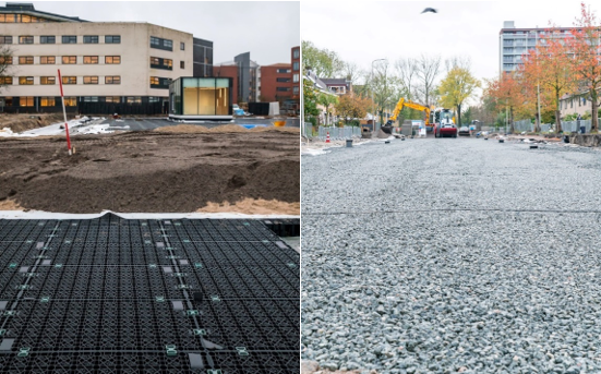 Afbeelding: (Links) Waterbergingskratten onder groen stadhuis plein. Het regenwater in de berging wordt benut voor het groen op het plein. (Rechts) Aanleg waterbergende fundering onder de rijbaan. In natte tijden een buffer die in droge tijden ingezet kan worden voor groen.