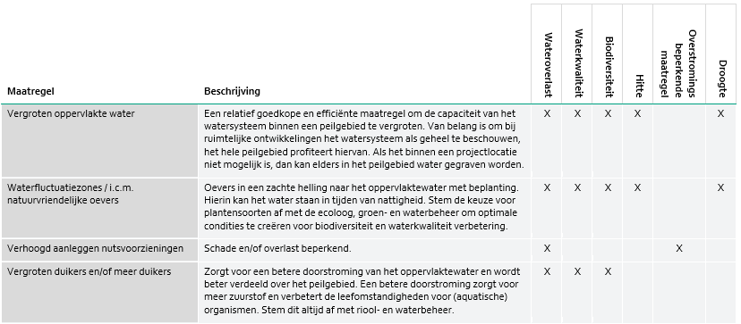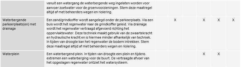 Tabel 2.2 geeft een overzicht aan waterbergende maatregelen die genomen kunnen worden om wateroverlast op het maaiveld te beperken. Waterbergende maatregelen zijn van belang om regenwater tijdens extremen op te vangen en het watersysteem te ontzien.