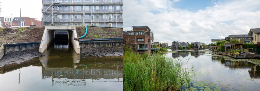 (Links: een vergrootte duiker voor een betere doorstroming Kooimanpark, rechts: ruimte voor water Weidevenne )