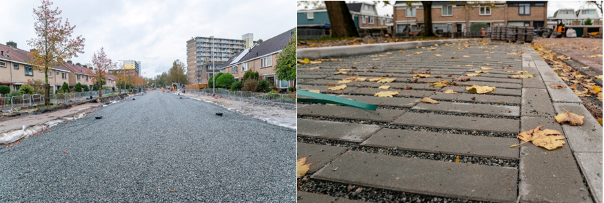 (Links) Aanleg waterbergende weg Wheermolen -Oost. (Rechts) Waterbergende parkeerplaatsen Overwhere -Zuid