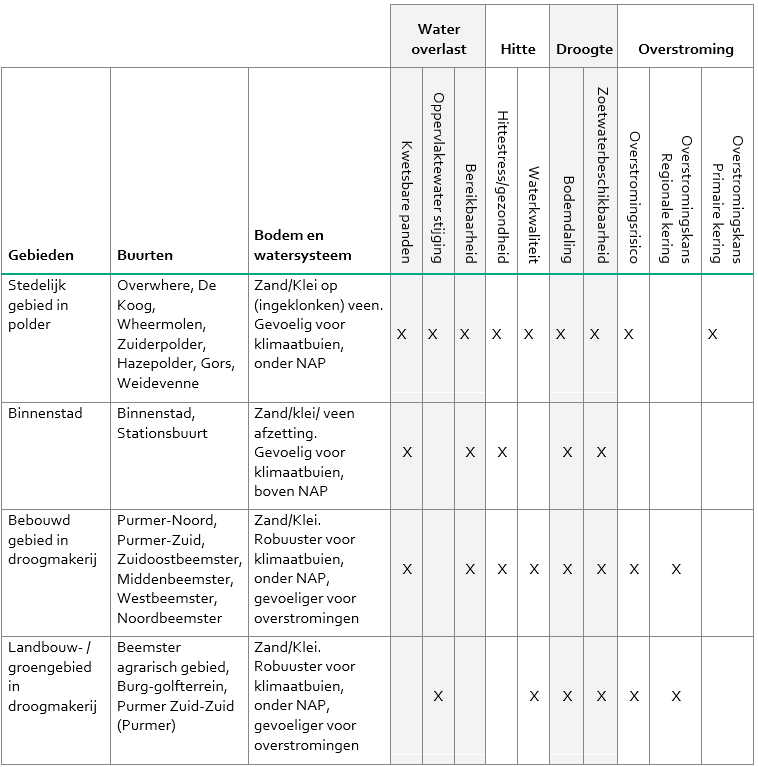 Er is onderscheid in de gemeente tussen de omgeving van de Beemster en de rest van Purmerend. Waar de Beemster bestaat uit bebouwing in een groen gebied, heeft de rest van Purmerend juist groen in een bebouwd gebied. De droogmakerijen Beemster en Purmer hebben van nature een robuuster watersysteem dan onze ondiepe polders. De verschillen in omgeving hebben invloed op de opgave en de klimaatadaptieve maatregelen die genomen kunnen/moeten worden in het openbare gebied.