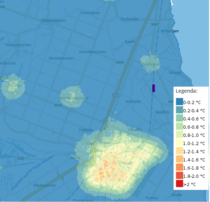 Door klimaatverandering worden de zomers warmer, hoge luchttemperaturen overdag en ’s nachts. Anderzijds leidt een versteende omgeving met gebrek aan schaduw zelf tot een hogere luchttemperatuur. Verharding houdt warmte vast en zorgt voor een hitte-eilandeffect (figuur 1). Vooral ’s nachts zorgt het hitte-eilandeffect ervoor dat de luchttemperatuur in versteend gebied een paar graden warmer is dan in landelijk gebied. Figuur 1 laat zien dat er in Purmerend sprake is van een hitte eiland effect in het stedelijke gebied, in mindere mate in de dorpen Zuidoostbeemster en Middenbeemster. In de Westbeemster en Noordbeemster is hier geen sprake van.