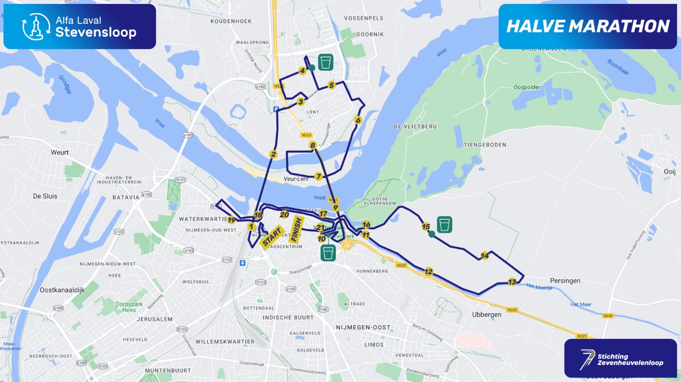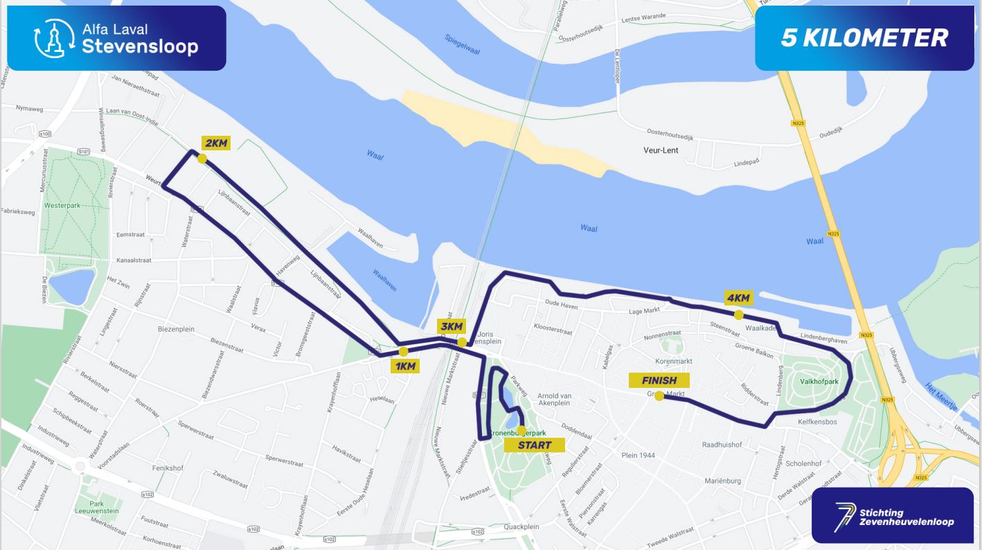 dat de start van de hardloopwedstrijd (5 km, 10 km, en 21,5 km) is in het Kronenburgerpark en de finish op de Grote Markt in het centrum van Nijmegen;