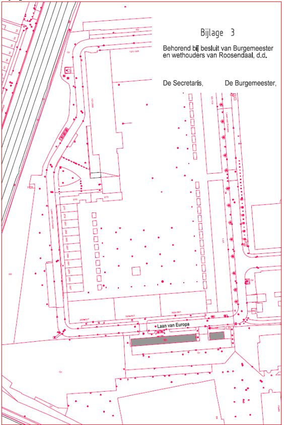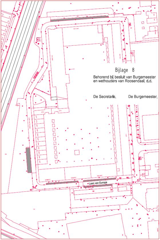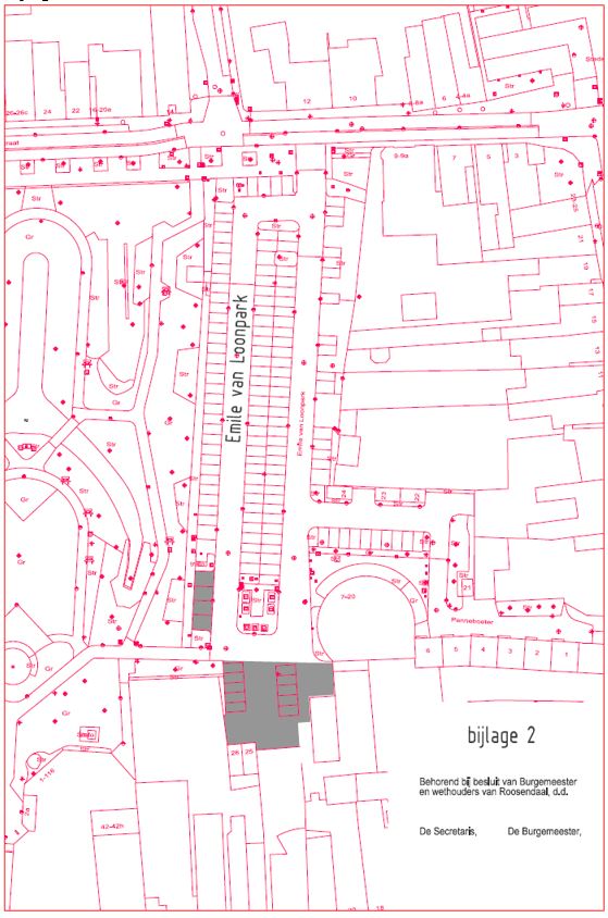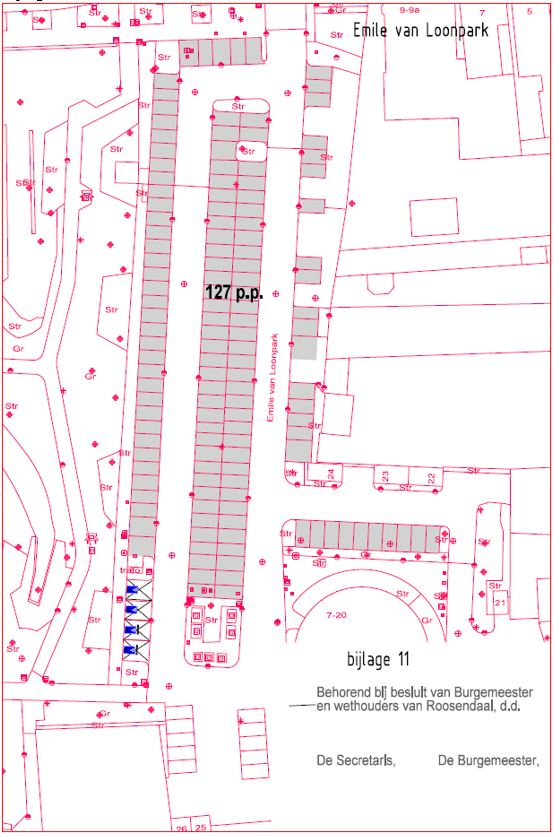 Als plaatsen, waarop zowel tegen betaling van belasting zoals bedoeld in artikel 1, onder c, van de tarieventabel van de “Verordening parkeerbelastingen Roosendaal”, als door vergunninghouders als bedoeld in artikel 2, lid 1 van de "Parkeerverordening Roosendaal” geparkeerd mag worden, aan te wijzen de volgende weggedeelten en terreinen, zoals nader aangeduid op de als bijlage 1 bij dit besluit gevoegde plattegrond;