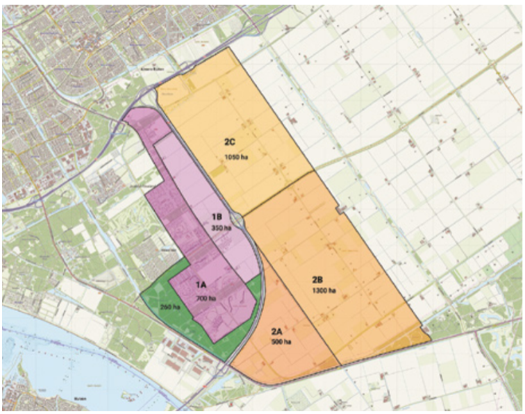 De terminologie is gewijzigd van fases naar delen en deelgebieden. Dus in ontwikkeling is deel 1, met deelgebied 1a en 1b. Deel 2, met deelgebieden 2a, 2b en 2c moeten nog worden voorbereid. In figuur 1 zijn de deelgebieden opgenomen. Deel 1, is het lichtpaarse en donkerpaarse gebied en deel 2 is 3 tinten oranje.