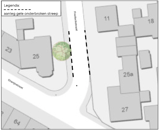 - Naar aanleiding van vorenstaande wordt een parkeerverbod ingesteld aan weerszijden van de Frederikstraat door het aanbrengen van een gele onderbroken streep over een lengte van ca. 15 meter, gerekend vanaf eindpunt van het kruispunt met de Oranjestraat.