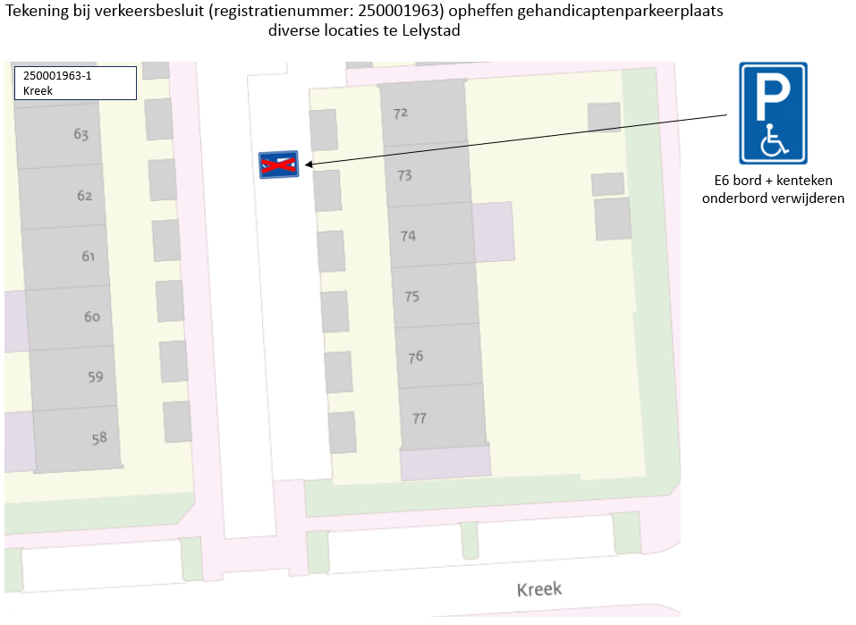 250001963-1 Opheffen op kenteken gereserveerde gehandicaptenparkeerplaats locatie Kreek te Lelystad door het verwijderen van het bord E6 (gehandicaptenparkeerplaats) van bijlage 1 van het Reglement verkeersregels en verkeerstekens 1990 en het verwijderen van het kentekenonderbord.