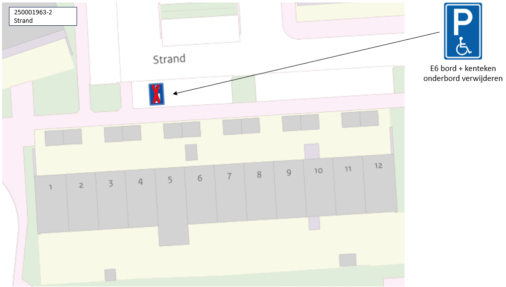 250001963-2 Opheffen op kenteken gereserveerde gehandicaptenparkeerplaats locatie Strand te Lelystad door het verwijderen van het bord E6 (gehandicaptenparkeerplaats) van bijlage 1 van het Reglement verkeersregels en verkeerstekens 1990 en het verwijderen van het kentekenonderbord.