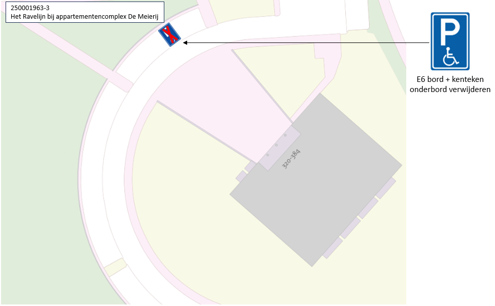 250001963-3 Opheffen op kenteken gereserveerde gehandicaptenparkeerplaats locatie Het Ravelijn bij appartementencomplex De Meierij te Lelystad door het verwijderen van het bord E6 (gehandicaptenparkeerplaats) van bijlage 1 van het Reglement verkeersregels en verkeerstekens 1990 en het verwijderen van het kentekenonderbord.