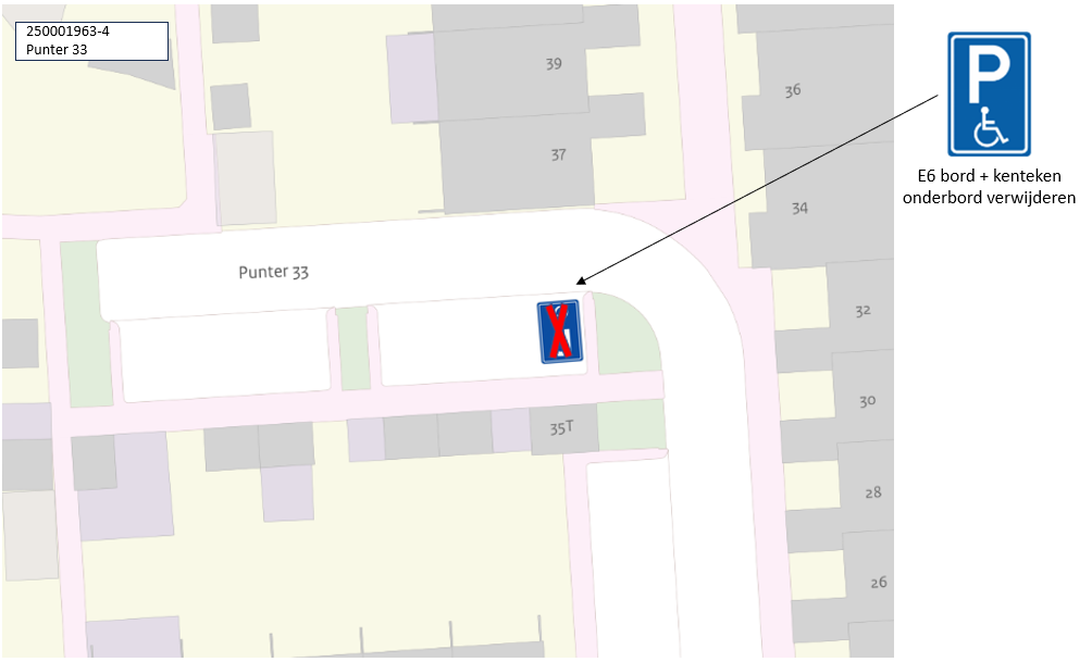 250001963-4 Opheffen op kenteken gereserveerde gehandicaptenparkeerplaats locatie Punter 33 te Lelystad door het verwijderen van het bord E6 (gehandicaptenparkeerplaats) van bijlage 1 van het Reglement verkeersregels en verkeerstekens 1990 en het verwijderen van het kentekenonderbord.