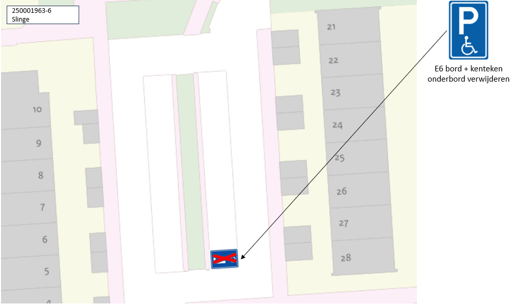 250001963-6 Opheffen op kenteken gereserveerde gehandicaptenparkeerplaats locatie Slinge te Lelystad door het verwijderen van het bord E6 (gehandicaptenparkeerplaats) van bijlage 1 van het Reglement verkeersregels en verkeerstekens 1990 en het verwijderen van het kentekenonderbord.