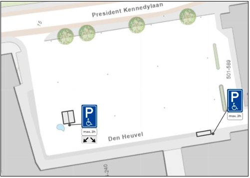 - De gemeente heeft daarom op de Den Heuvel drie gehandicaptenparkeerplaatsen gereserveerd die zijn aangeduid met bord E6 van bijlage 1 van het RVV 1990.