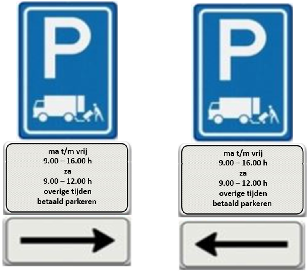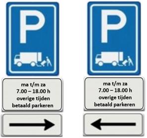 Vaststellen: Gelegenheid bestemd voor het onmiddellijk laden en lossen van goederen (bord E7 conform Bijlage 1 van het RVV 1990 met de onderborden OB501r, de OB501l, "ma t/m vrij 09.00 - 16.00 h, za 9.00 - 12.00 h, overige tijden betaald parkeren)