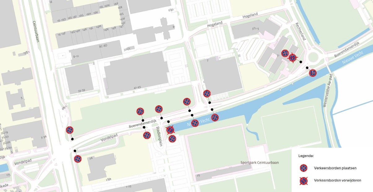 dat dit gerealiseerd kan worden door het plaatsen van borden E2 van bijlage 1 van het RVV 1990 en daarmee een stopverbod in te stellen aan de Boerendanserdijk tussen Ceintuurbaan en Rechterland;
