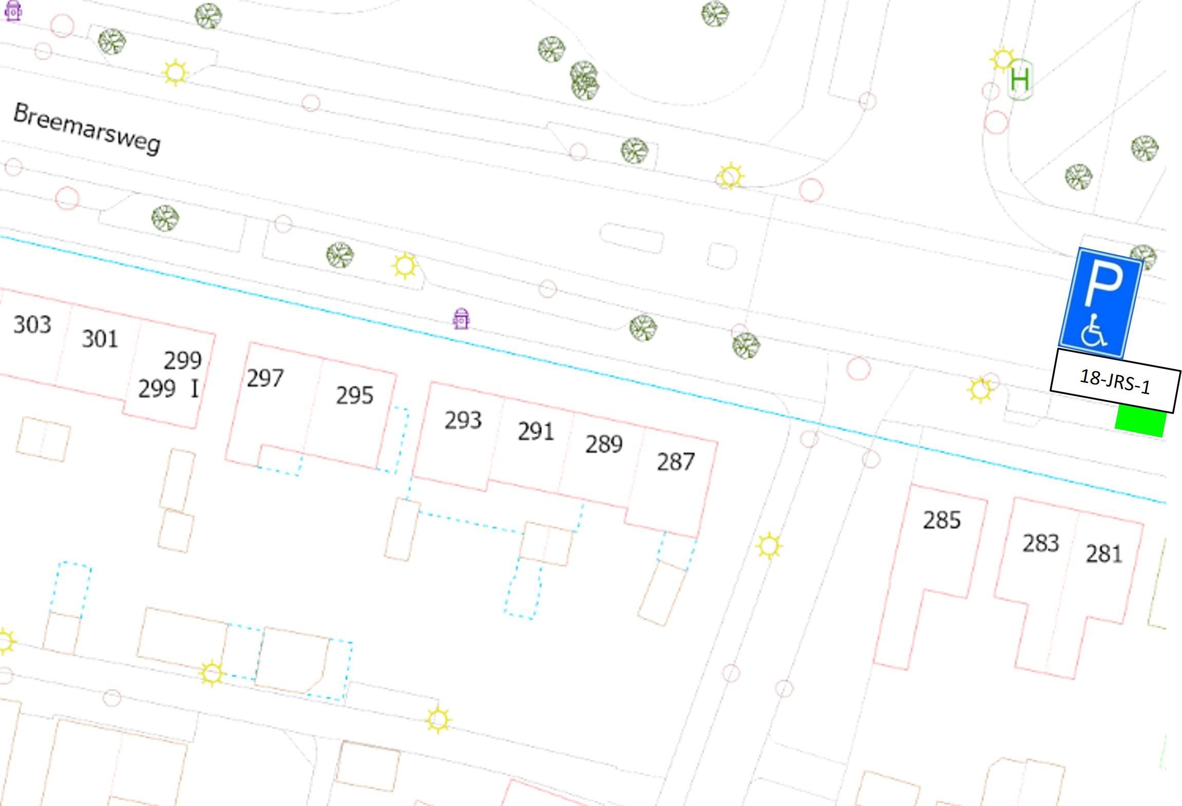 Het aanwijzen en inrichten van een gehandicaptenparkeerplaats op kenteken aan de Breemarsweg, ter hoogte van perceel 281, door het plaatsen van het verkeersbord E6 van het RVV 1990 met onderbord met kenteken 18-JRS-1, zoals is aangegeven op de overzichtstekening in dit besluit.